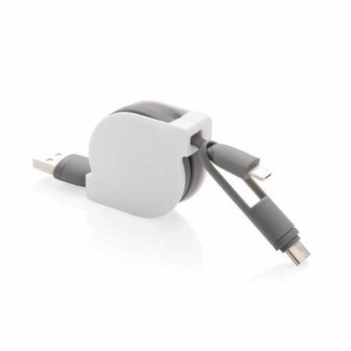 Cablu de incarcare compact si retractabil 3 in 1 cu tip C si conector fata-verso pentru dispozitive iOS si Android care necesita micro USB.
