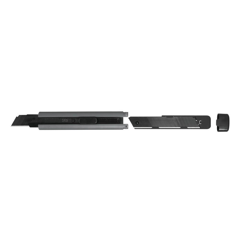 Cutter cu lama flexibila neagra de 18 mm (10 segmente de taiere si o rezerva), glisor cu oprire automata, carcasa din plastic si lama din otel cu ghidaj pentru, pentru taieri usoare pana la dificile, in cutie.