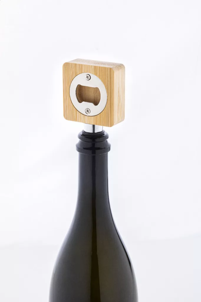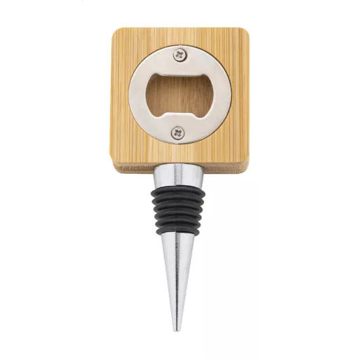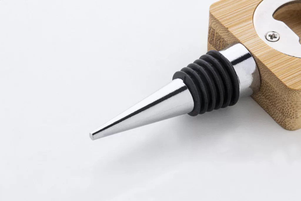 Dop de vin metalic cu deschizator de sticle patrat din bambus.