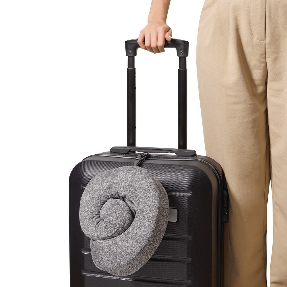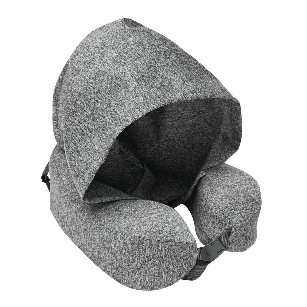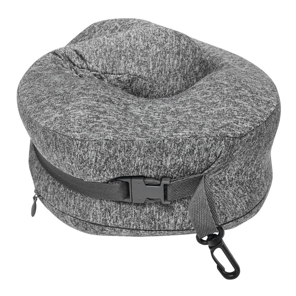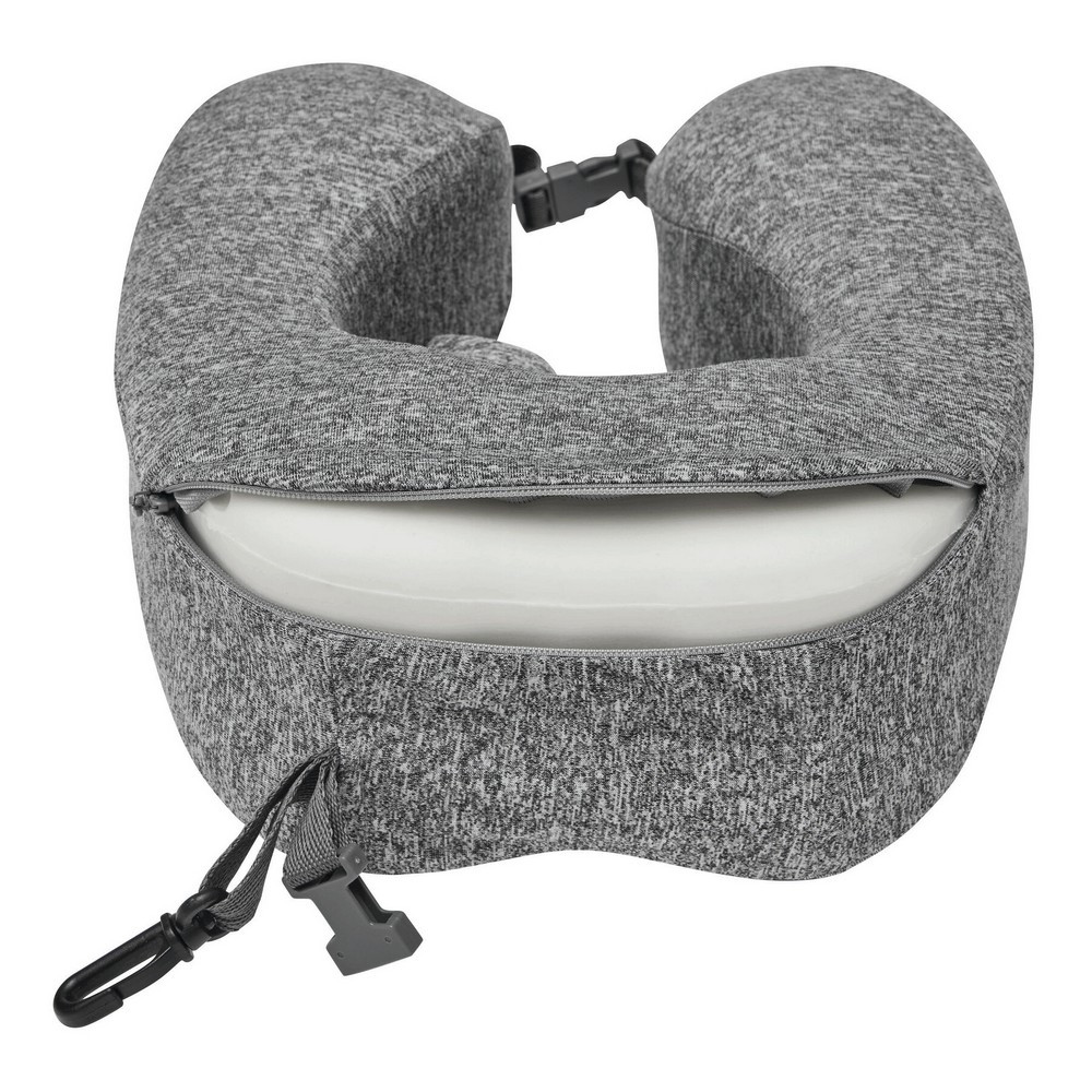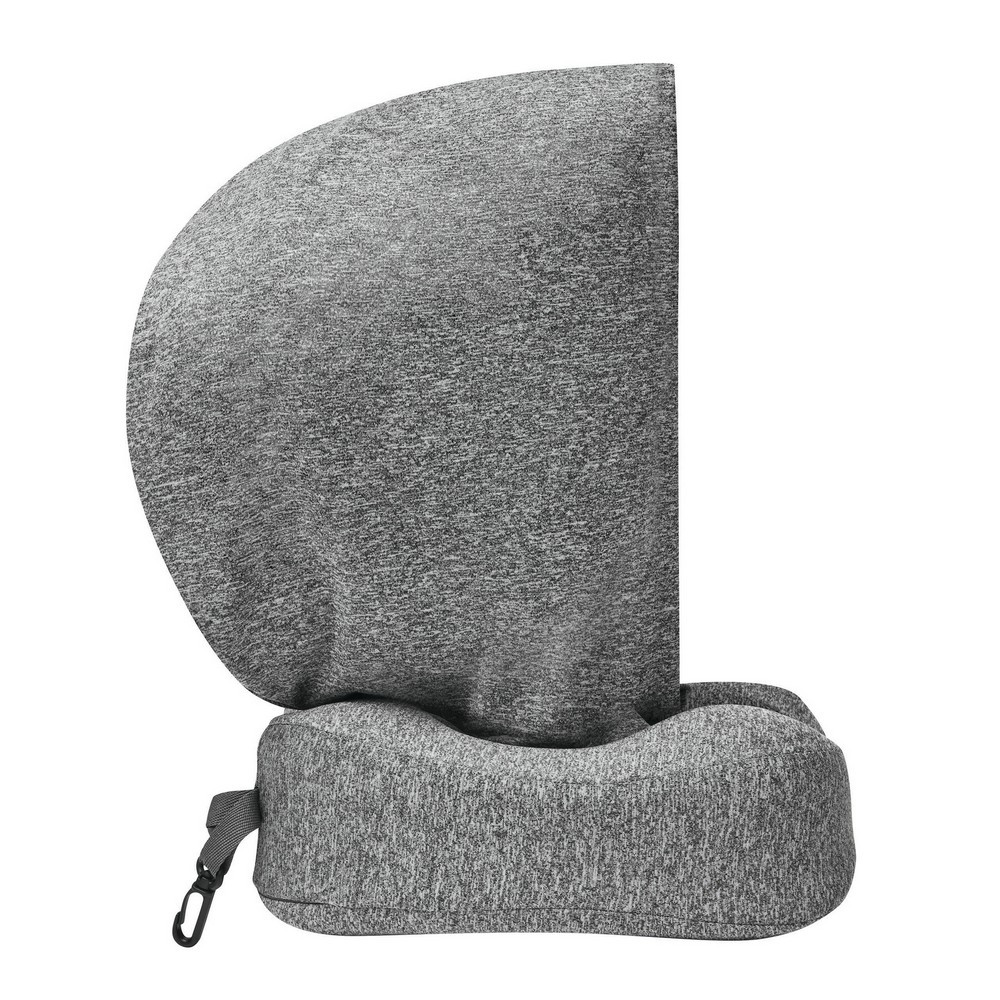 Perna cervicala din spuma cu memorie: cu gluga integrata pentru acoperirea capului si fetei, inchidere reglabila cu capse, husa detasabila si lavabila din jerseu, umpluta cu spuma cu memorie pentru confort optim, bucla cu carabina mica pentru agatare sau transport (carabiniera NU este potrivita pentru alpinism), perna cervicala poate fi rulata si inchisa cu capsa pentru economie de spatiu.