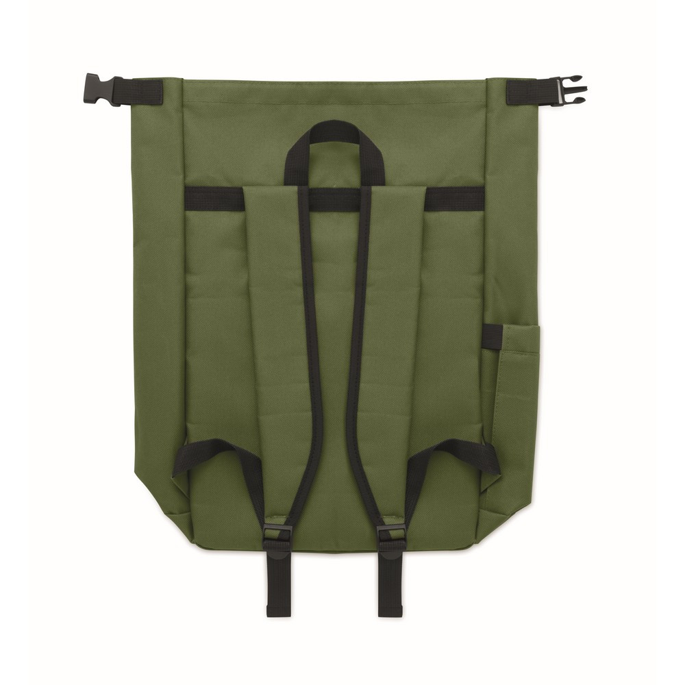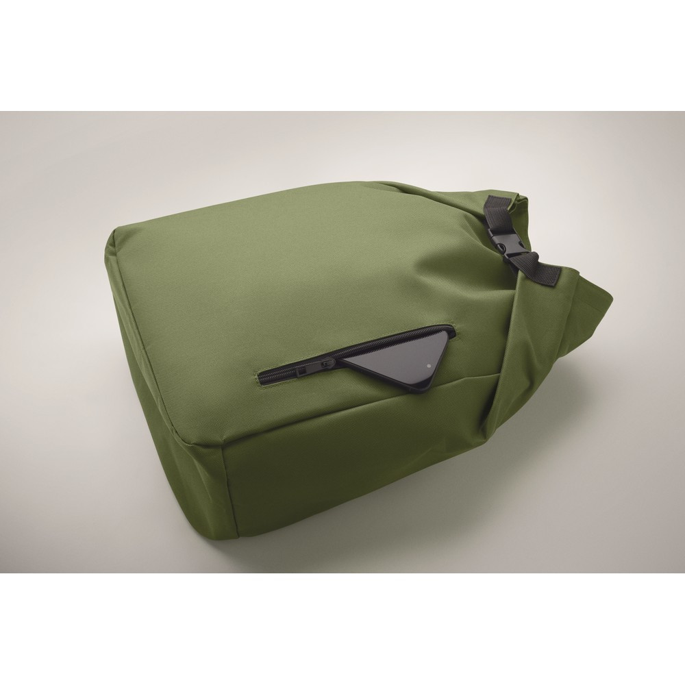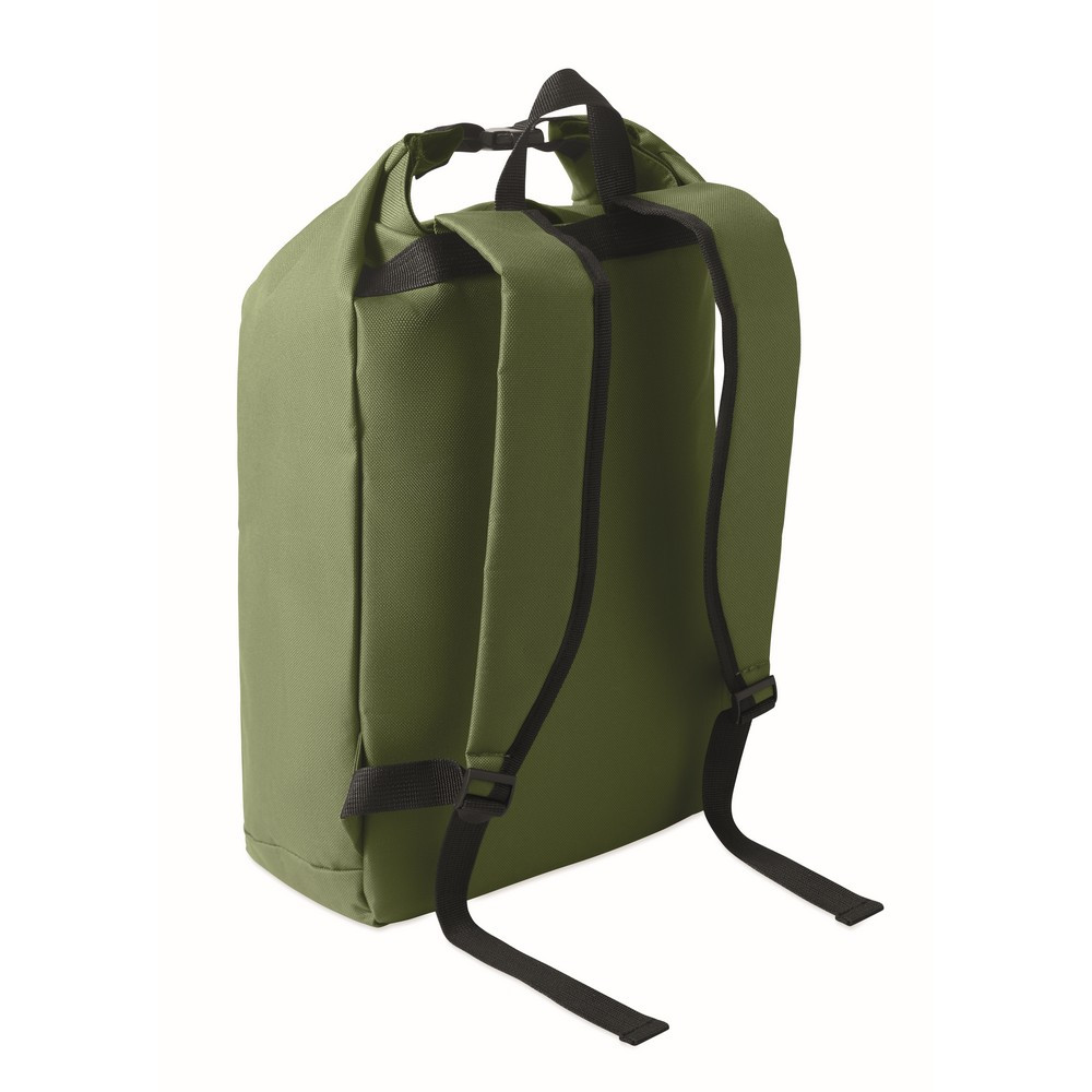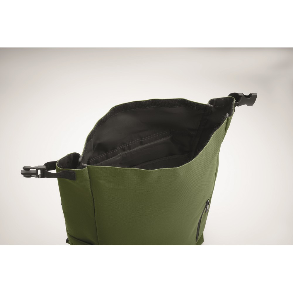 Rucsac laptop rolltop de 15 inch fabricat din poliester RPET 600D captusit RPET 210D.