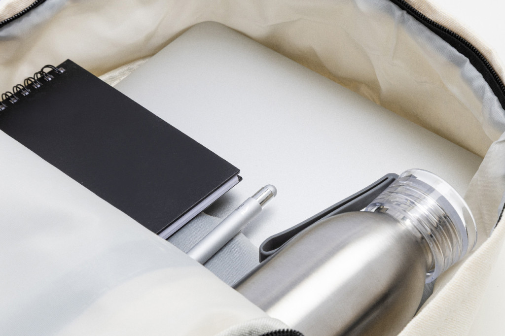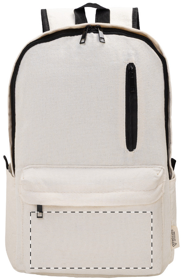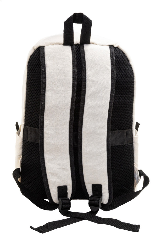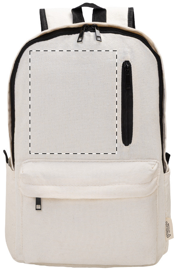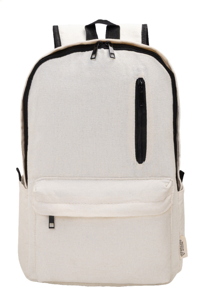 Rucsac din panza reciclata cu compartiment principal cu fermoar, compartiment captusit pentru laptop (15"), 2 buzunare frontale cu fermoar, buzunare laterale, curea pentru carucior, spate si bretele captusite.