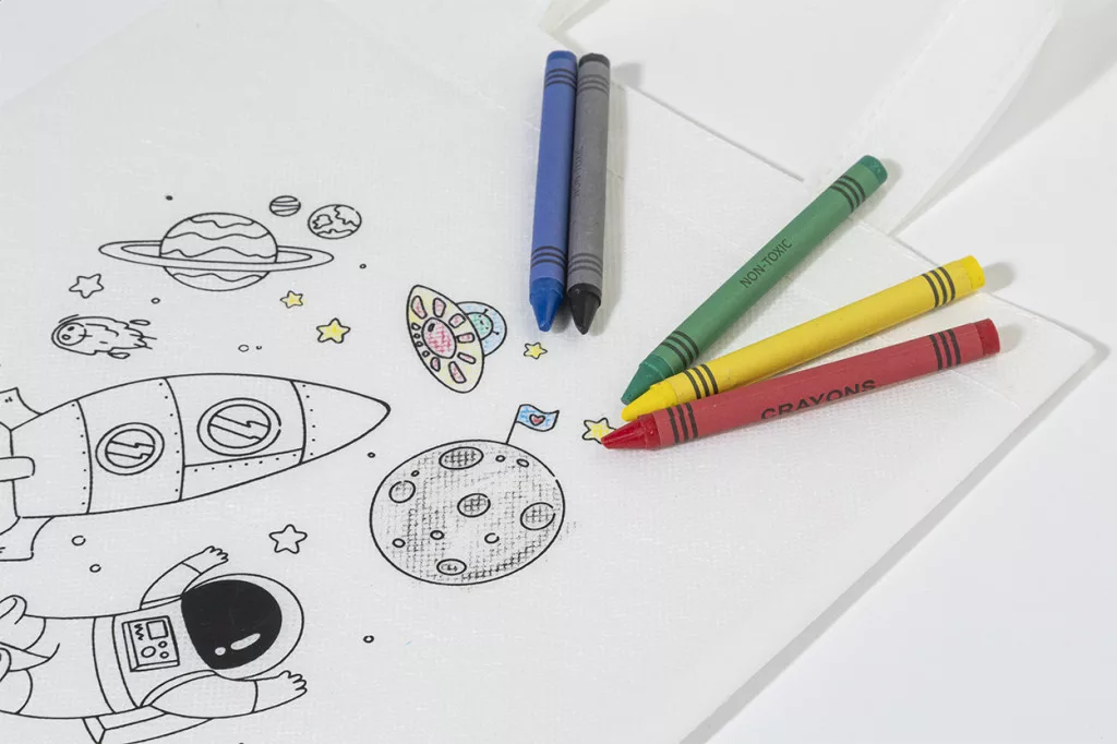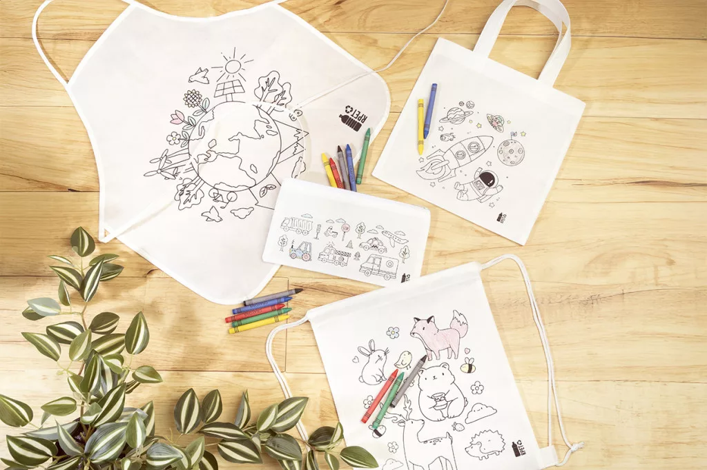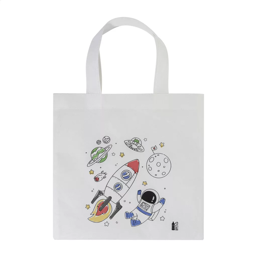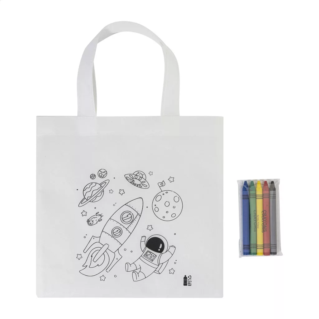 Sacosa mica de cumparaturi colorata din material netesut RPET cu 5 creioane colorate.