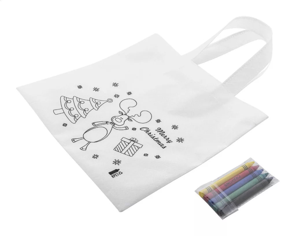 Sacosa de colorat cu design de Craciun din material netesut RPET si 5 creioane colorate.