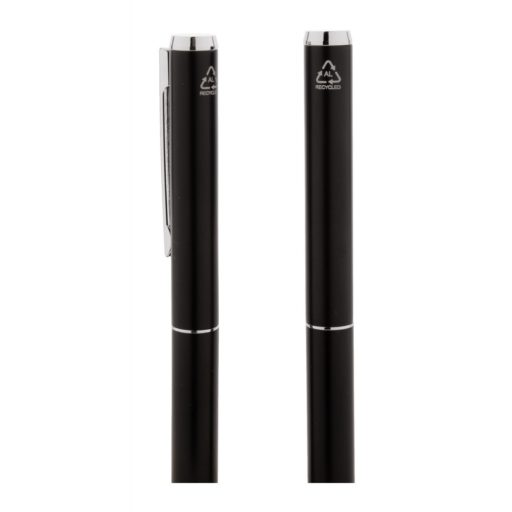 Set pixuri din aluminiu reciclat, cu roller si pix cu bila, in cutie cadou din hartie neagra.