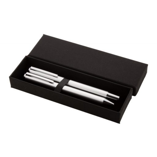 Set pixuri din aluminiu reciclat, cu roller si pix cu bila, in cutie cadou din hartie neagra.