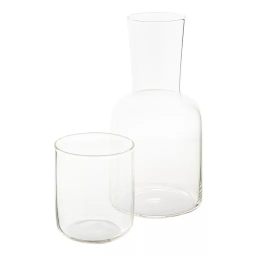 Set carafa de apa (800 ml) si pahar de baut (300 ml) din sticla borosilicata.