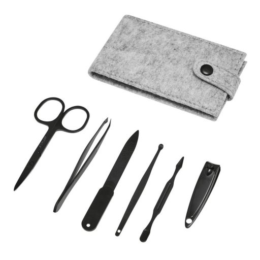 Set manichiura, 6 buc in husa din fetru RPET, contine o pereche de foarfece pentru unghii, pila de unghii, penseta, cleste pentru unghii, instrument de cuticule si betisor pentru urechi, husa cu capsa, in cutie.