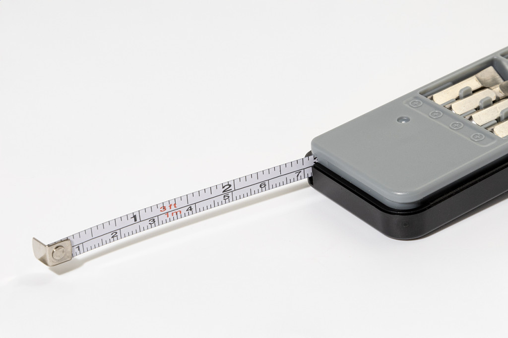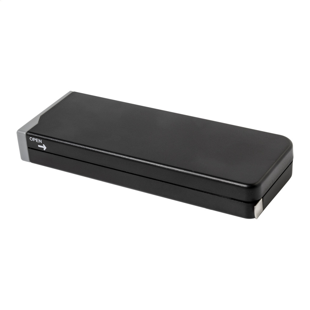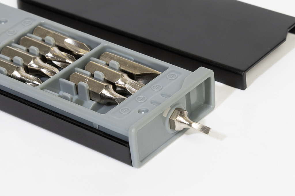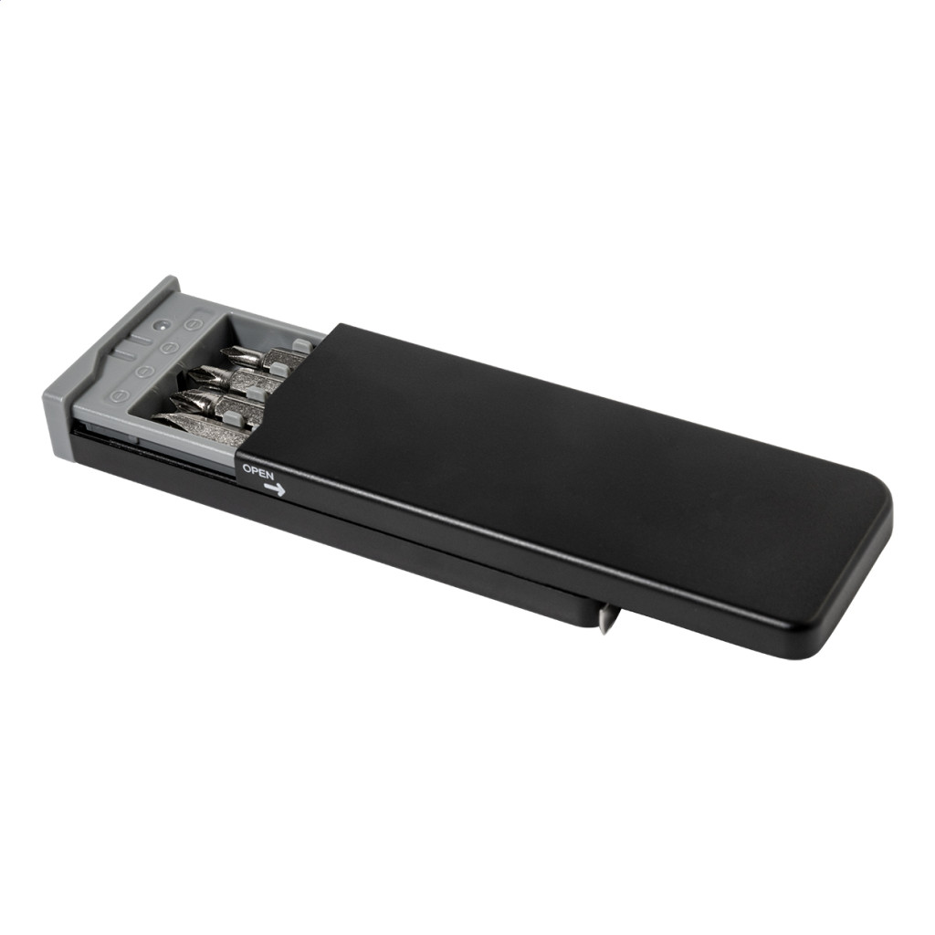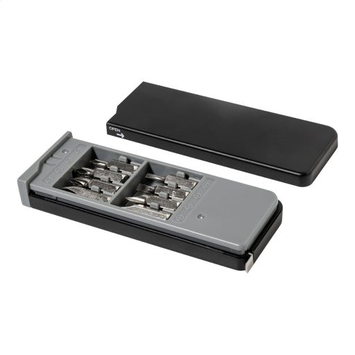 Set compact de scule in carcasa din ABS reciclat, cu 8 biti de surubelnita si ruleta incorporata de 1 m.