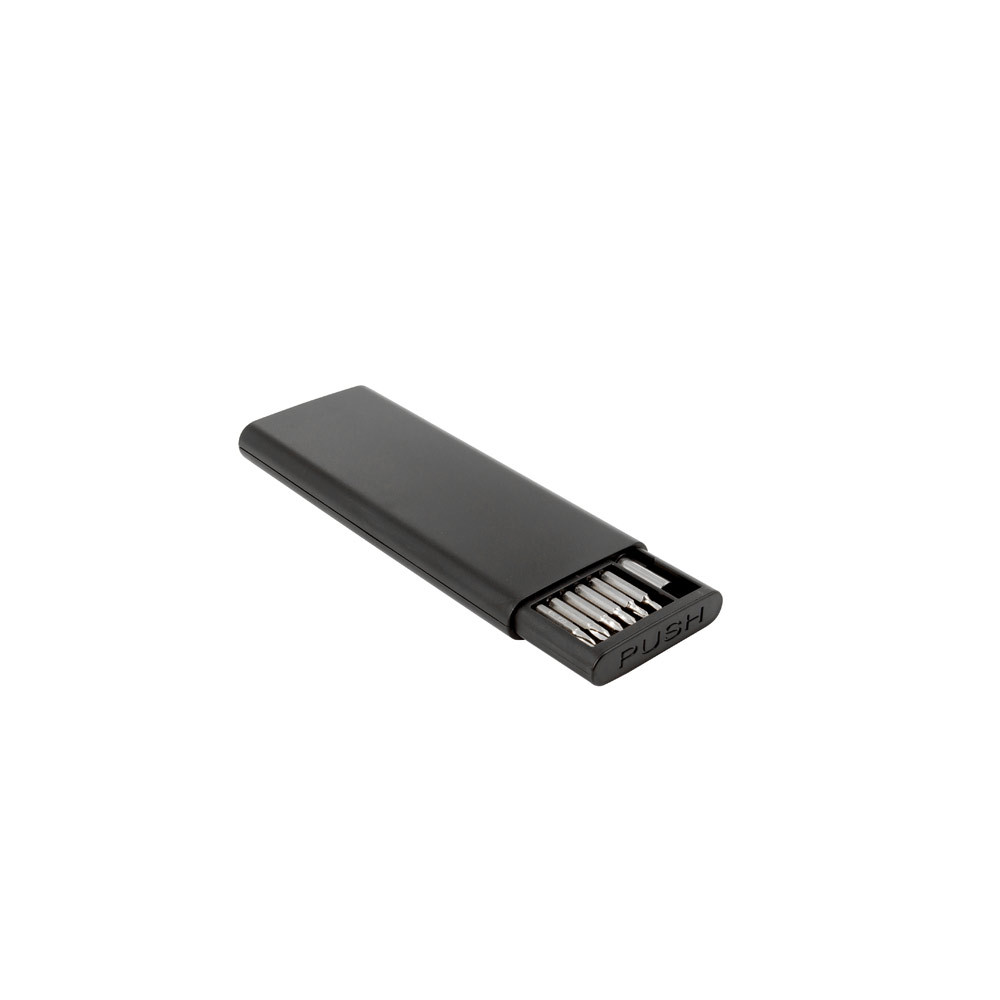 Cutia este fabricata din ABS reciclat (100% rABS), are inchidere magnetica si deschidere cu capse si include 1 maner de surubelnita si 24 de varfuri din otel carbon.