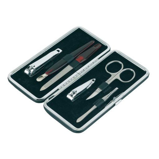 Set manichiura elegant include forfecuta, pila, penseta, cleste mic si mare, ambalat in etui rectangular cu buton lateral.