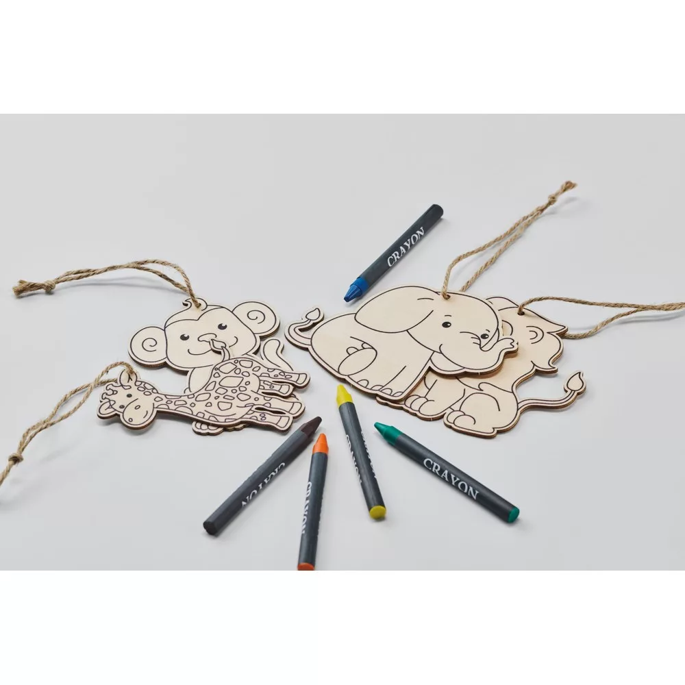 Set de pictura format din 4 figurine din lemn design de animale, cu corzi de iuta si 5 creioane colorate, ambalate intr-o sacosa netesuta cu cordon.