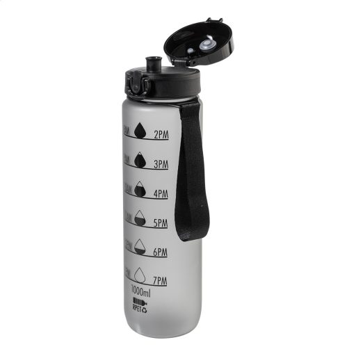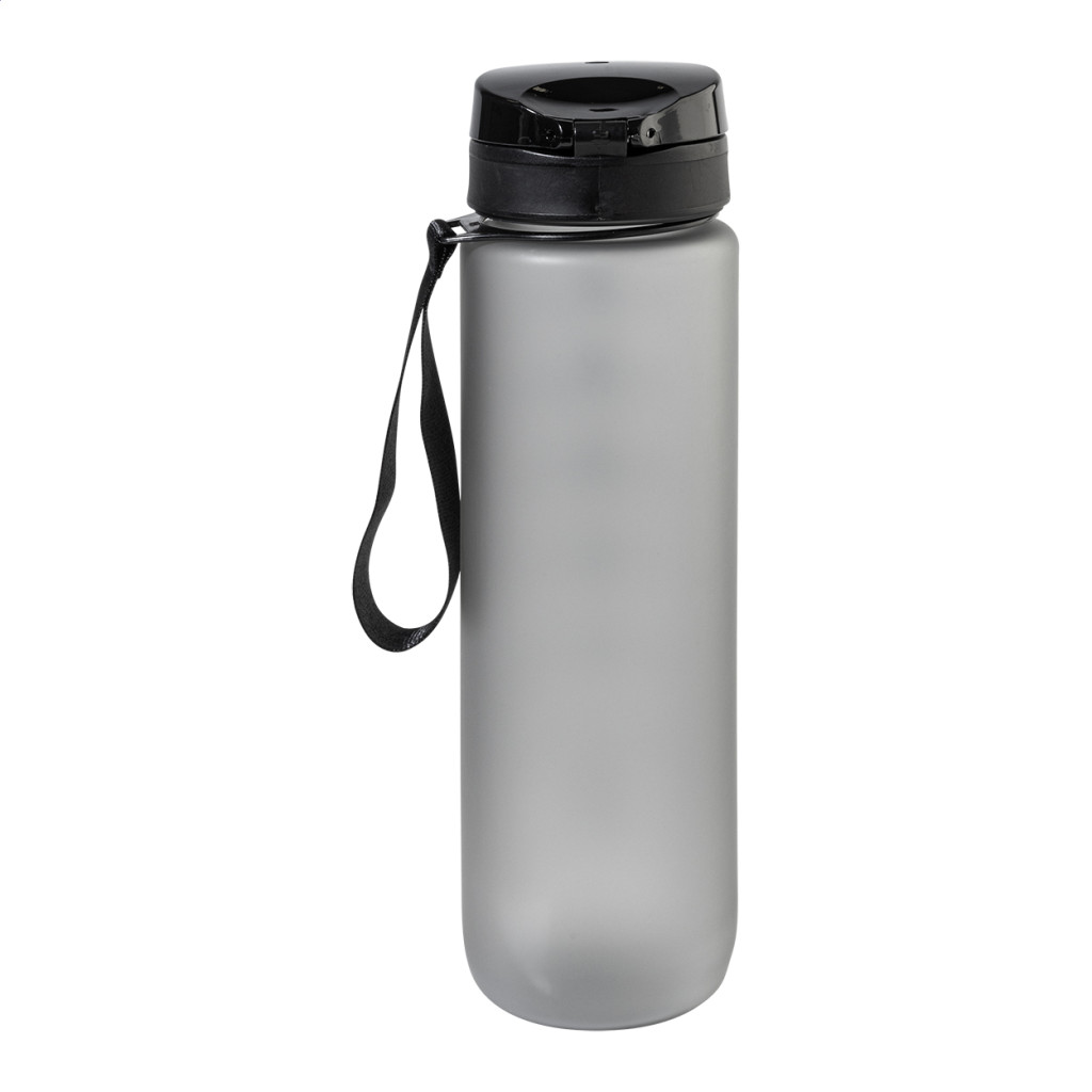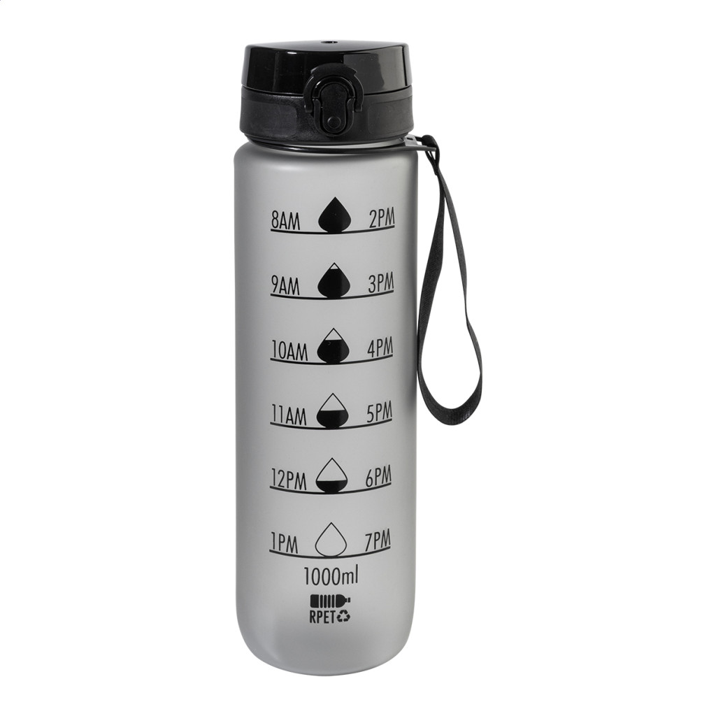 Sticla sport din RPET mat, cu marcaje motivationale pentru volum si timp, prevazuta cu capac rabatabil cu deschidere automata, blocare de siguranta si curea de transport.