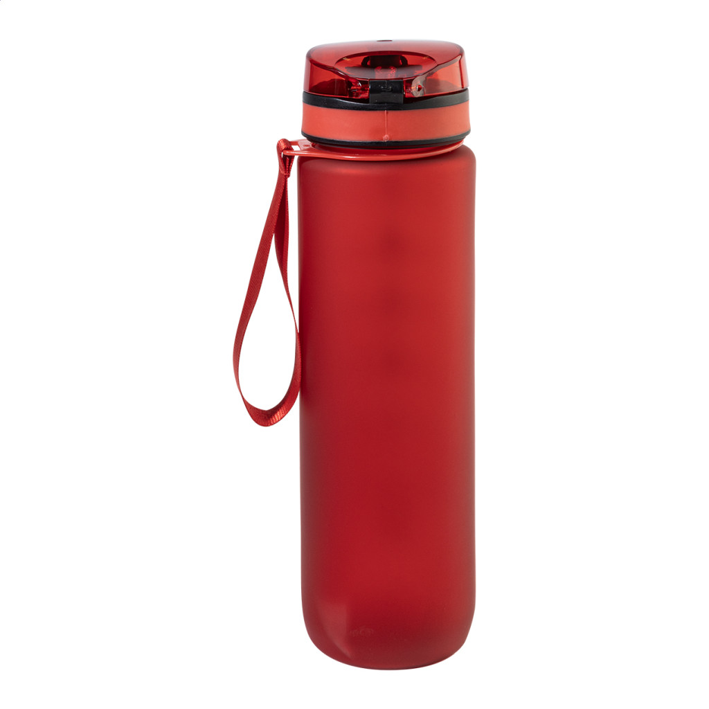 Sticla sport din RPET mat, cu marcaje motivationale pentru volum si timp, prevazuta cu capac rabatabil cu deschidere automata, blocare de siguranta si curea de transport.