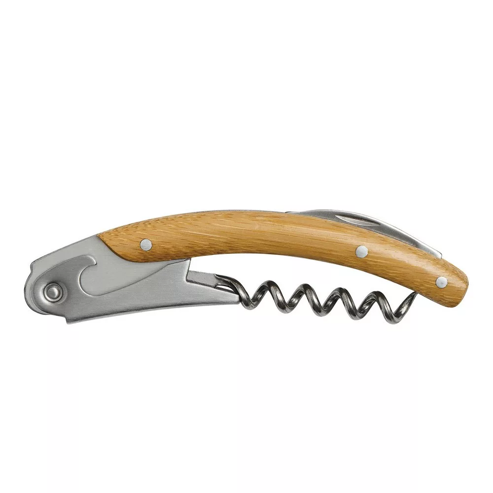 Cutit de ospatar cu cutit, deschizator de sticle si tirbuson, din otel inoxidabil cu maner din bambus, in cutie.