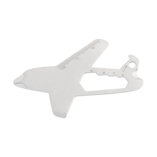 Breloc multifunctional din otel inoxidabil reciclat, in forma de avion, cu desfacator de sticle, rigla, surubelnite Philips si plate, chei hexagonale si cleste de taiat sarma.